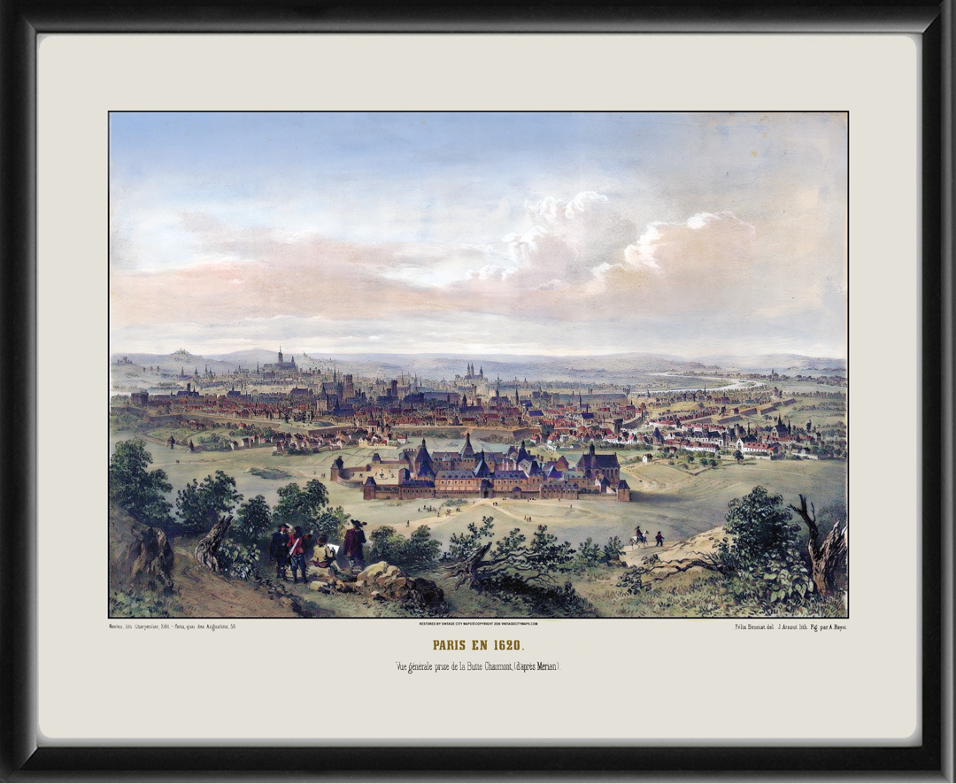 Restored bird’s eye view of Paris in 1620, by Felix Benoist, taken from the Butte Chaumont showing the Saint-Louis Hospital in the foreground,