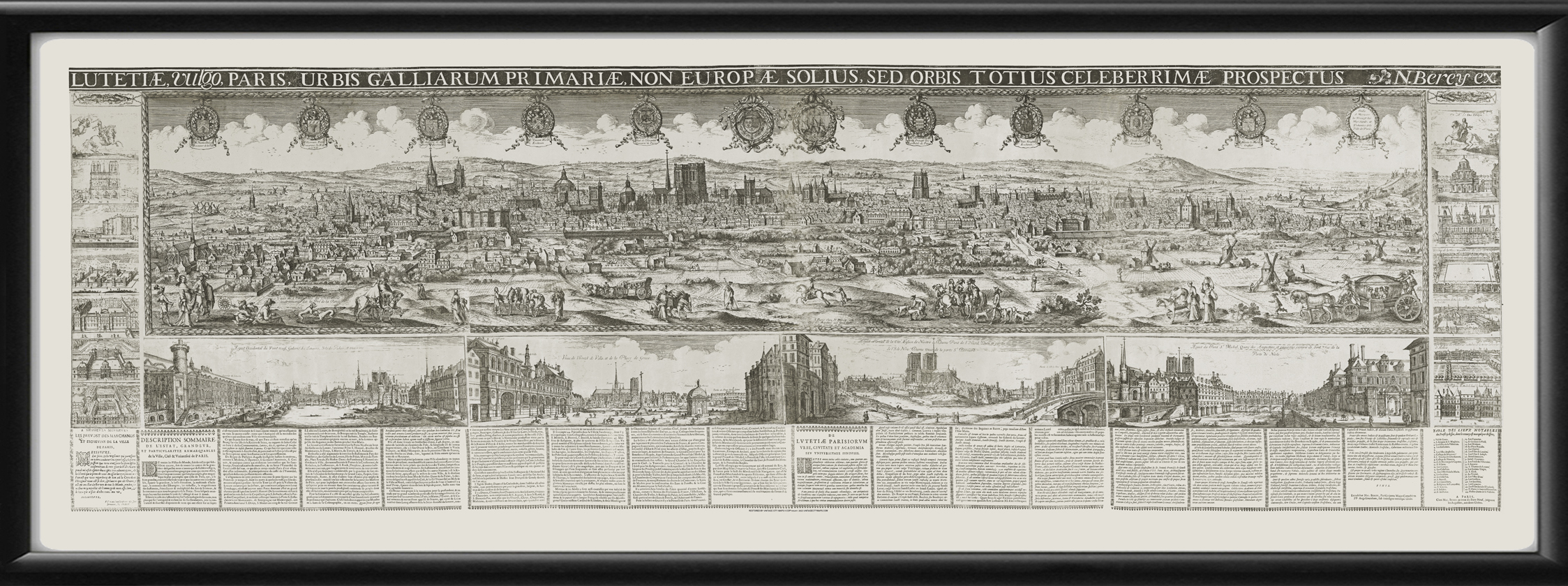 Restored panoramic view of “Lutetiae (known as) Paris, the French City, Best Not Only in Europe but in the Whole World”, Seen From engraving. 1669 by Alexis-Hubert Jaillot and Noel Cochin. Our large size is similar to the size of the original engraving.