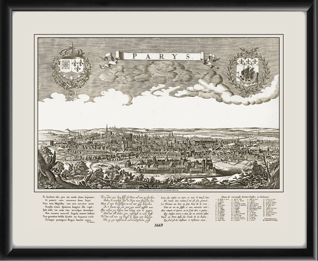 Restored bird’s eye view map of Paris, France, 1669 from the original engraving by Clemendt de Jonghe