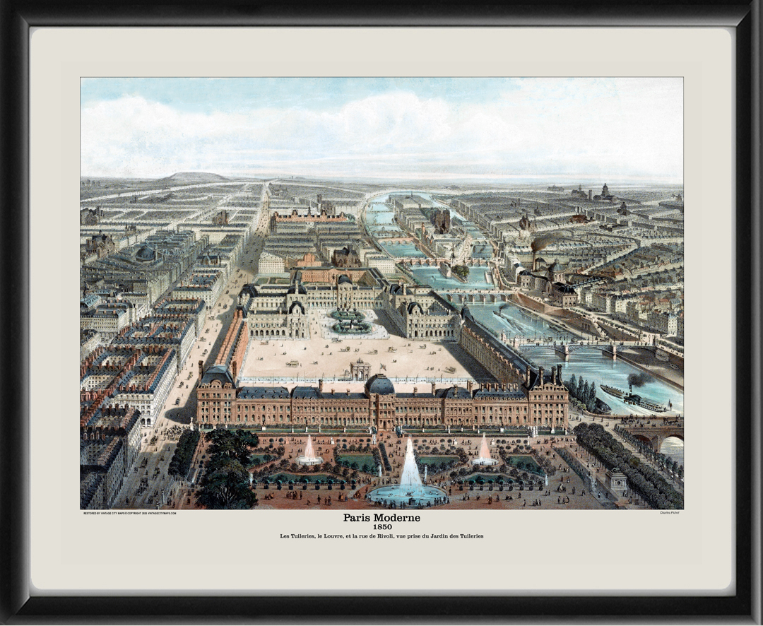 Restored bird’s eye view map of Paris, France – “Paris Moderne” – 1850 by Charles Fichot.
