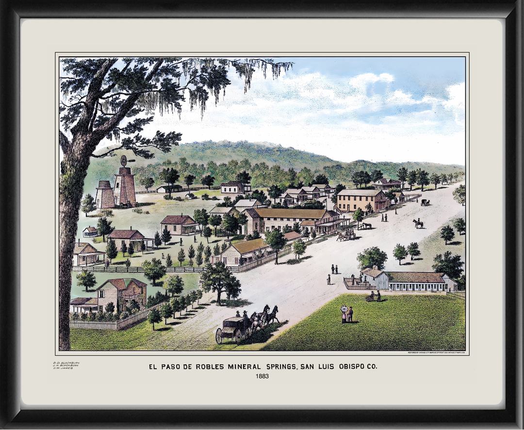 Restored bird’s eye view of Paso Robles (El Paso de Robles Mineral Springs), San Luis Obispo County, California, 1883, from the original engraving by D.D. Blackburn, J.H. Blackburn, and D.W. James.