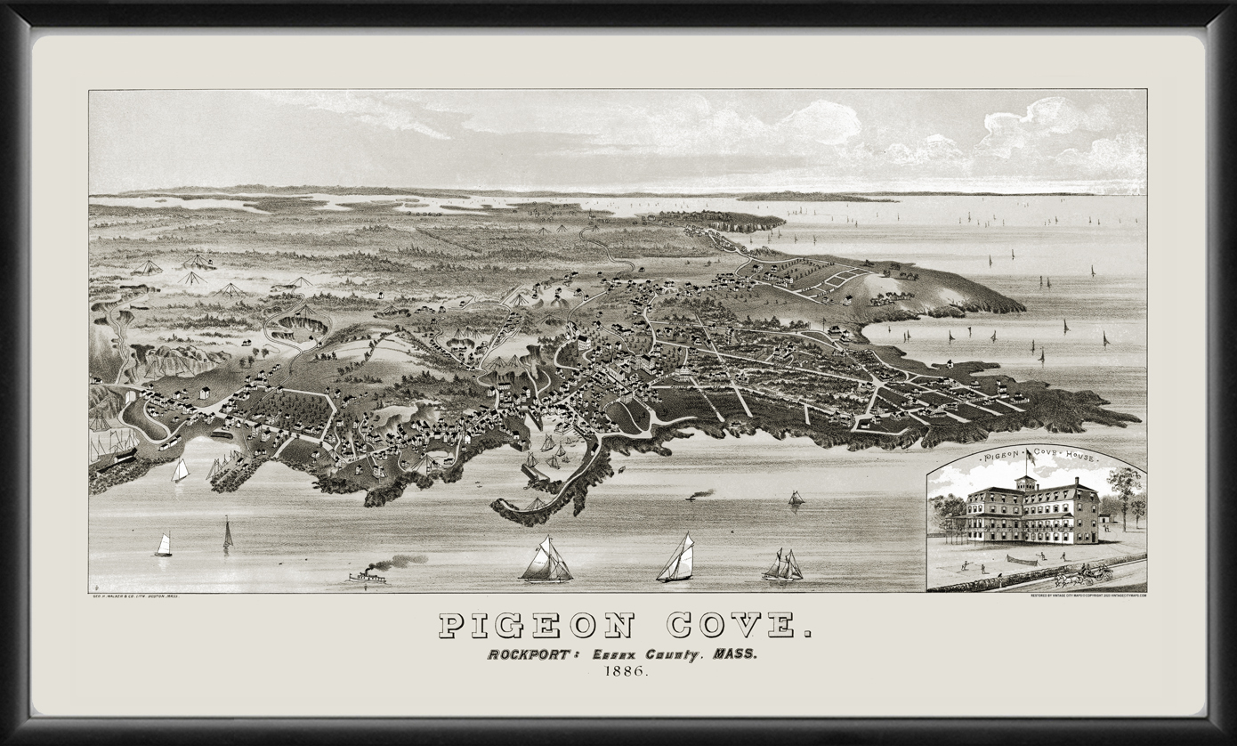 Restored bird’s eye view of Pigeon Cove, Rockport MA 1860 by George Walker