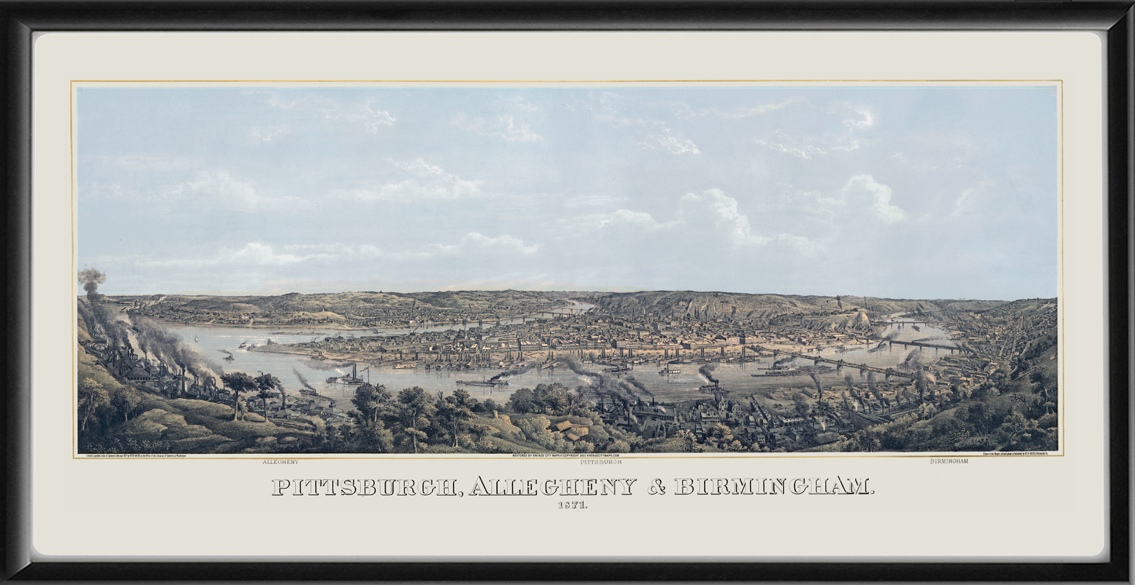 Restored bird’s eye view map of Pittsburgh, Allegheny & Birmingham, Pennsylvania, 1871 by Otto Krebs.