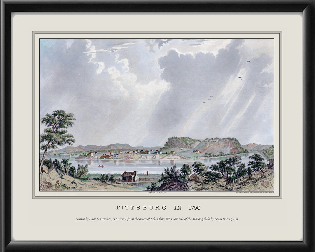 Restored panoramic view of Pittsburgh, Pennsylvania in 1790 and produced in 1845. Drawn by Capt. Seth Eastman, U.S. Army, from the original taken from the south side of the Monongahela by Louis Brantz, Esq. and engraved by John C. McRae.