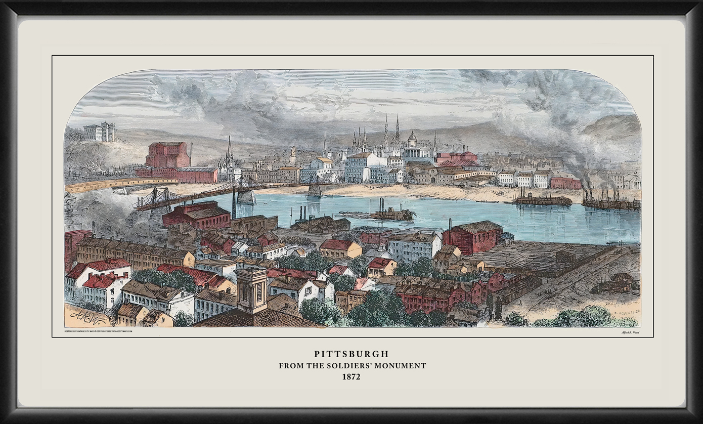 Restored panoramic bird’s eye view of Pittsburgh, Pennsylvania from the Soldiers Monument, 1872 by Alfred R. Waud