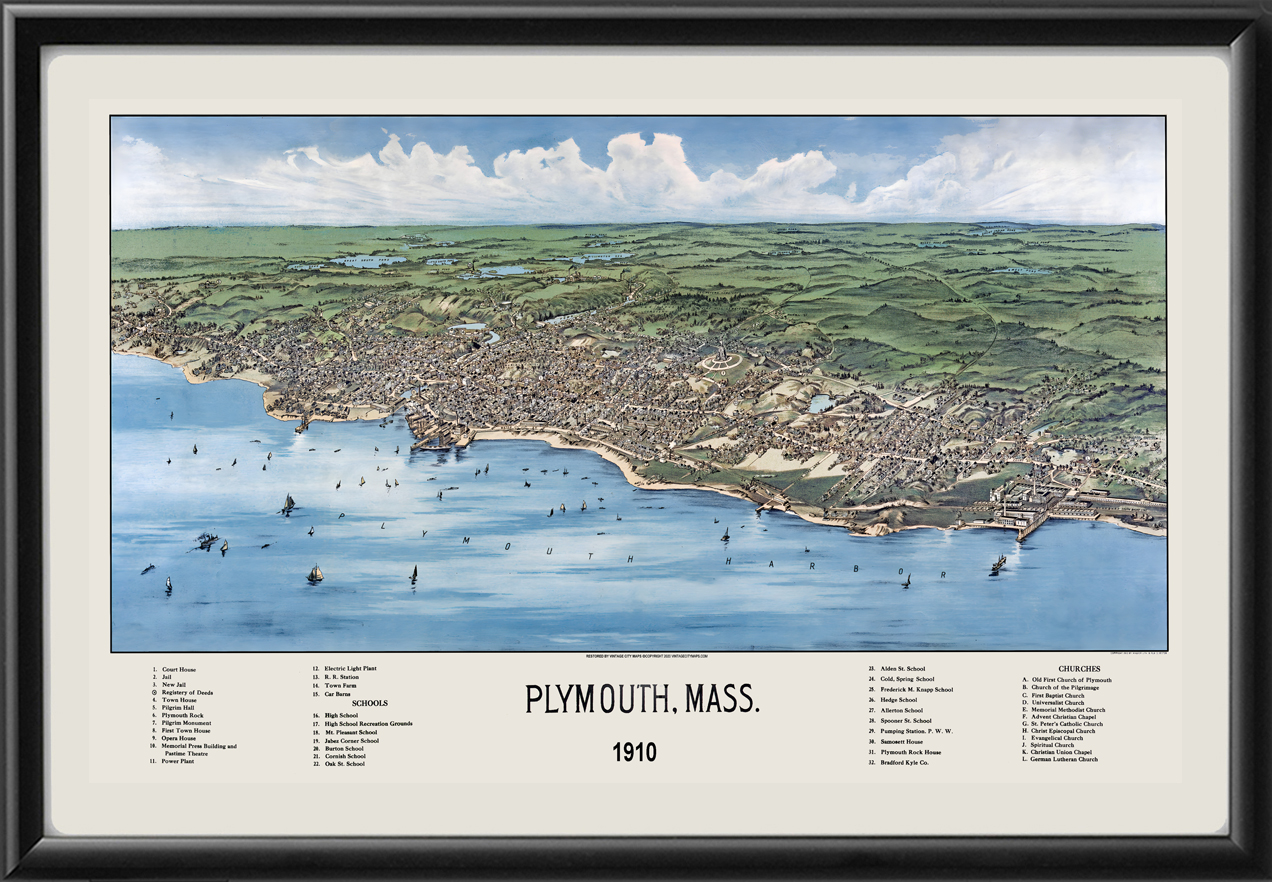 Restored bird’s eye view of Plymouth, Massachusetts, 1910 by George Walker