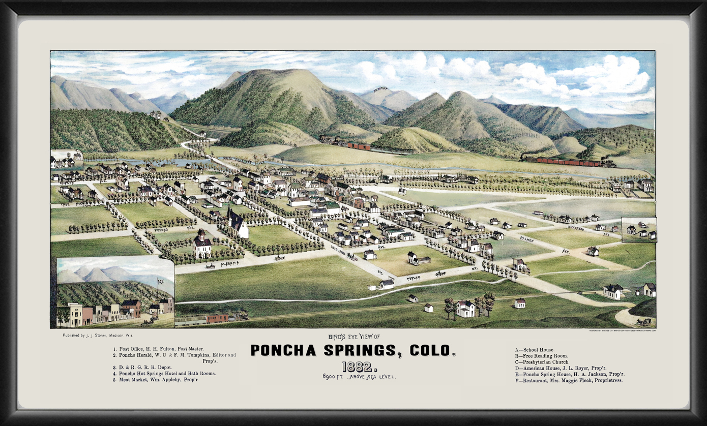 Restored bird’s eye view of Poncha Springs, Colorado, 1882 by Henry Wellge. Incorrectly named Poncho, Colo. by the artist.