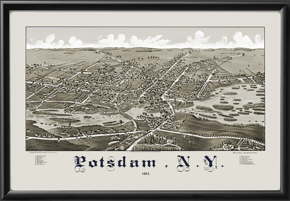 Restored bird’s eye view map of Potsdam, New York, 1885 by Lucien R Burleigh