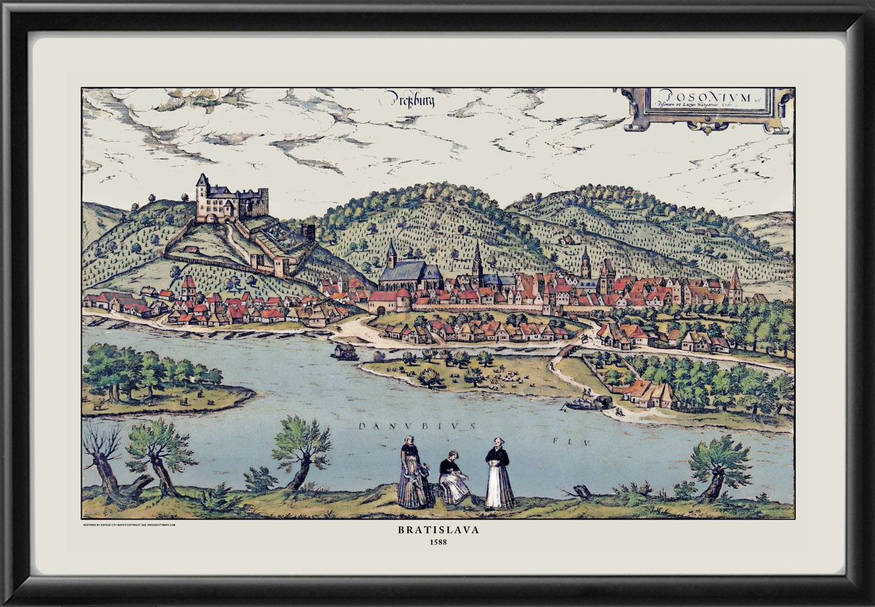 Restored bird’s eye view of Pressburg, Hungary (now Bratislava, Slovak Republic), 1588 by Georg Braun and Frans Hogenberg from their work, “Civitates Orbis Terrarum”, the first atlas of printed town plans.