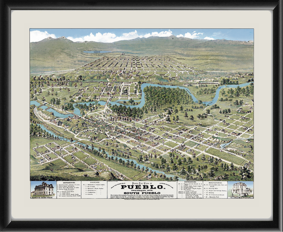 Restored and colored bird’s eye view map of Pueblo, South Pueblo, and Pueblo Colony, Colorado, 1874 by Eli Sheldon Glover.