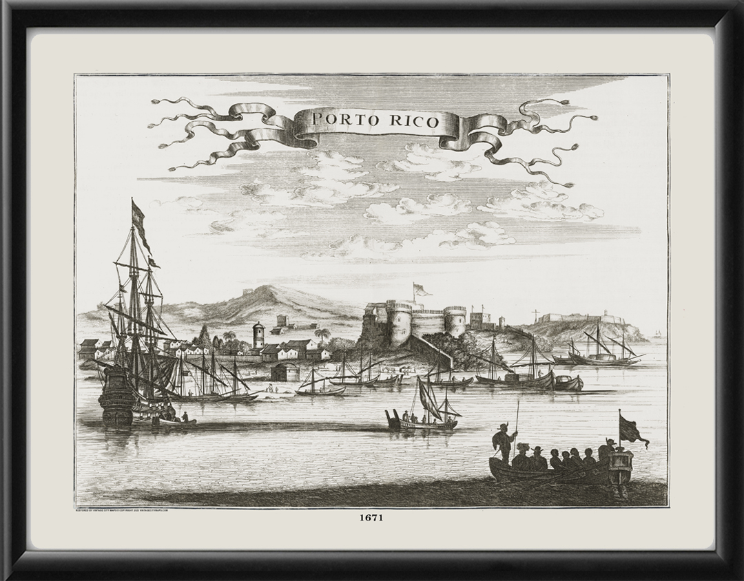 Restored panoramic view of San Juan, Puerto Rico, 1671, by Arnold Montanus, from America: “Being The Latest, And Most accurate Description Of The New World” by John Ogilby.