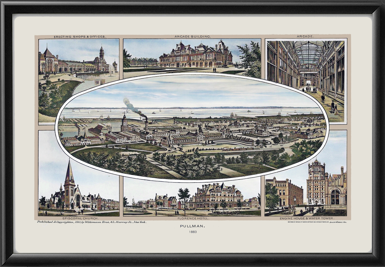 Restored bird’s eye view of the Pullman area of Chicago, Illinois, built by George Pullman as workers’ housing for employees of his railroad car company – the Pullman Palace Car Company, produced in 1883 by Louis Glaser