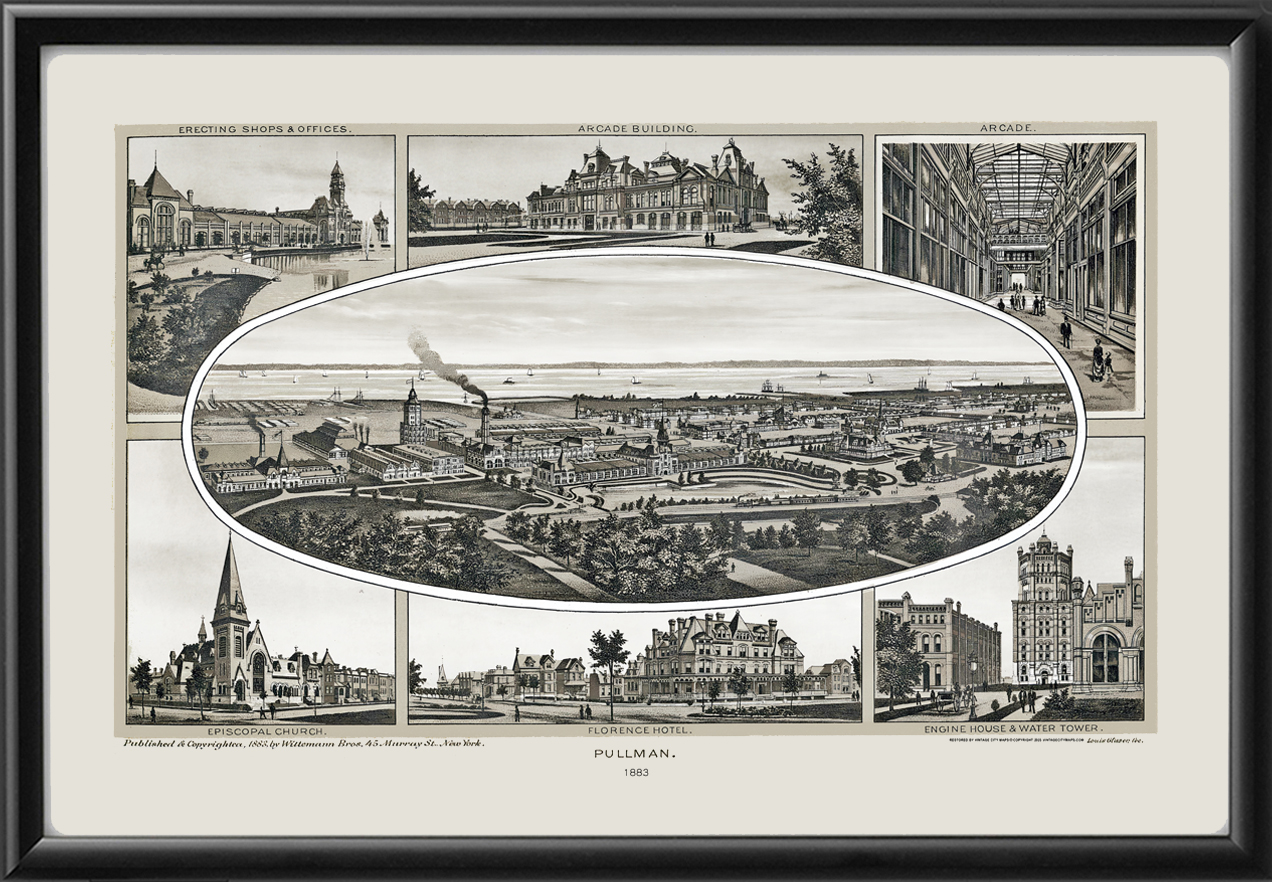 Restored bird’s eye view of the Pullman area of Chicago, Illinois, built by George Pullman as workers’ housing for employees of his railroad car company – the Pullman Palace Car Company, produced in 1883 by Louis Glaser