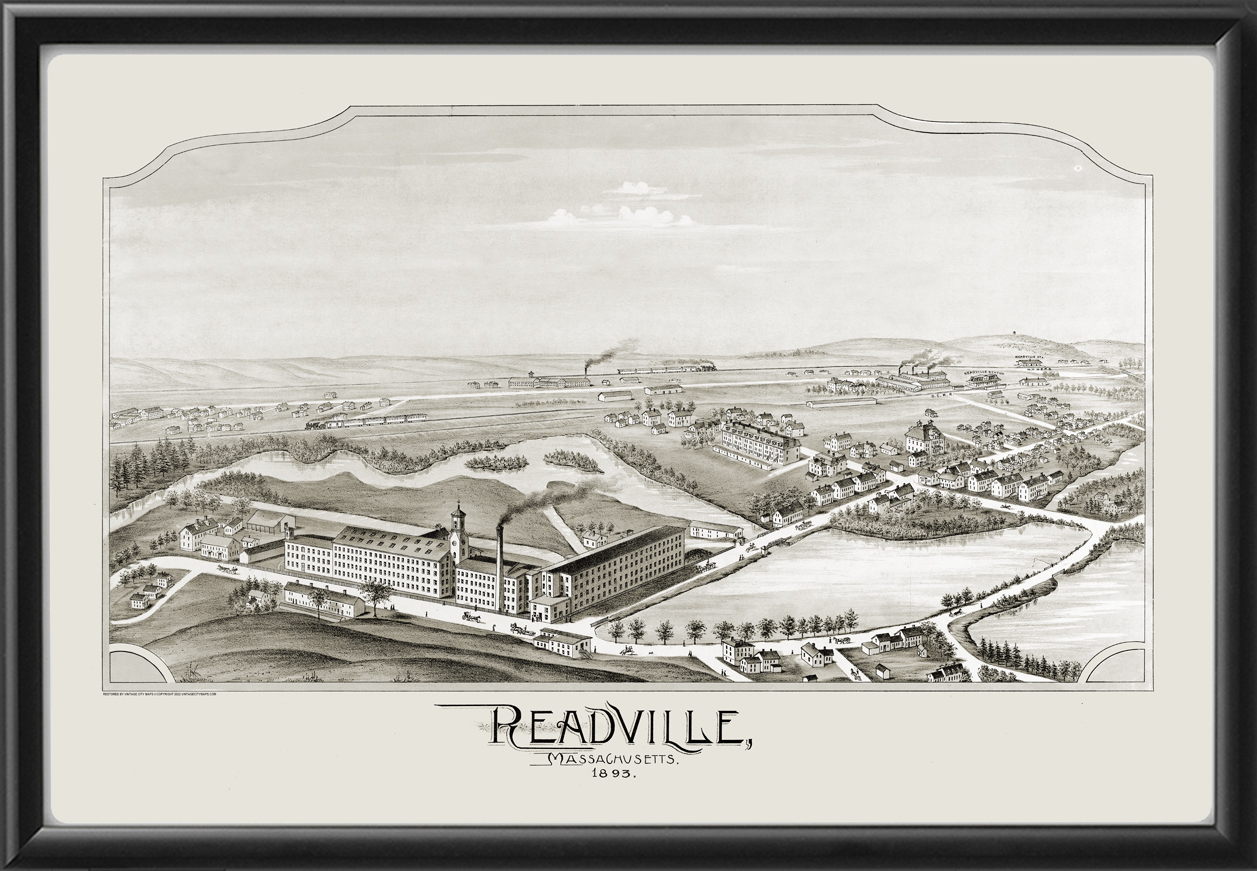 Restored bird’s eye view map of Readville in the Hyde Park section of Boston, Massachusetts, 1893 by Oakley Hoopes Bailey, showing the textile mill in the foreground.