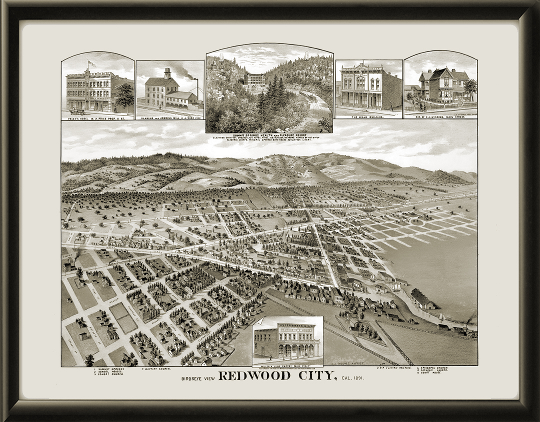 Restored bird’s eye view map of Redwood City, California, 1891 by E.S. Moore