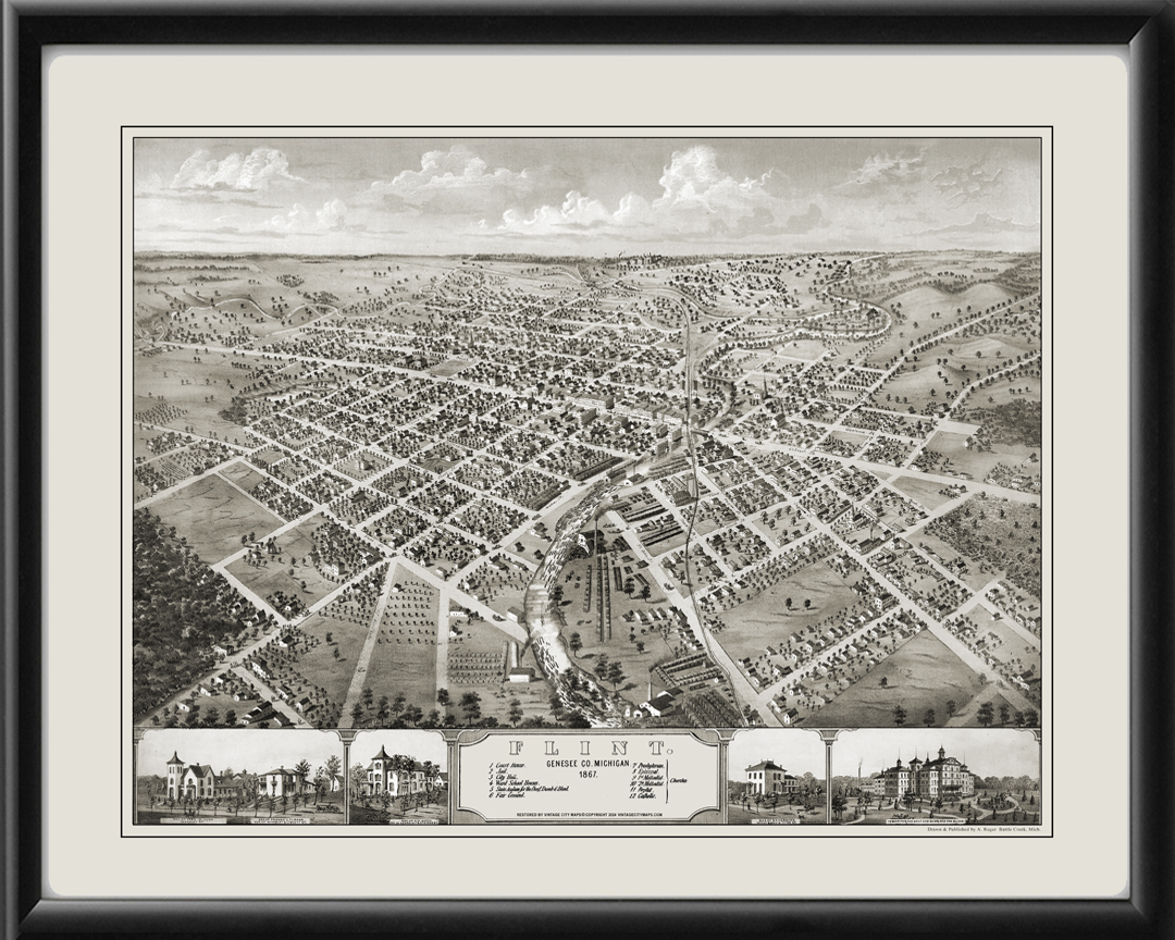 Restored bird’s eye view map of Flint, Michigan 1867 by Albert Ruger