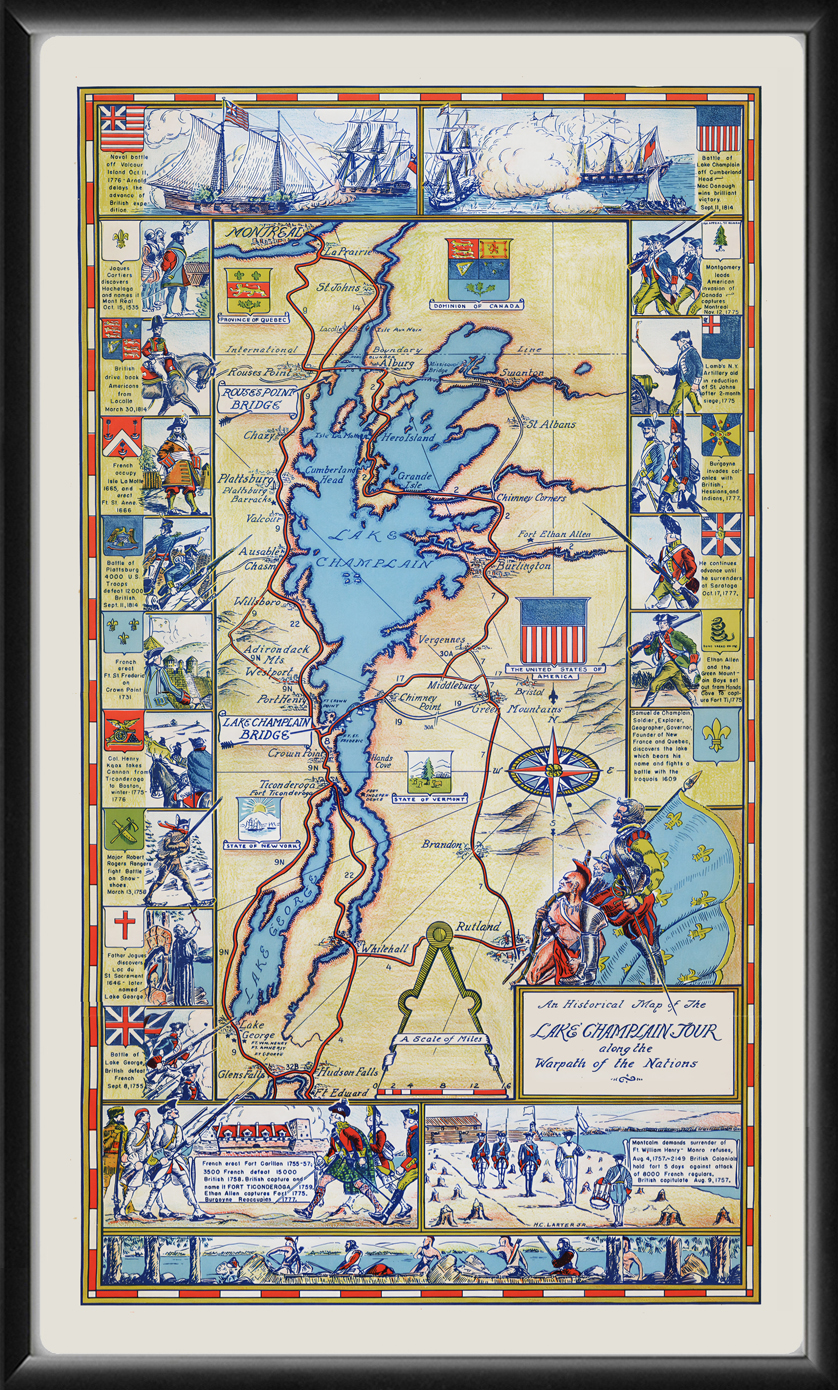 Restored pictorial map of the Lake Champlain Tour along the Warpath of the Nations, 1939, showing historic scenes, place names, landmarks, roads, and rivers.