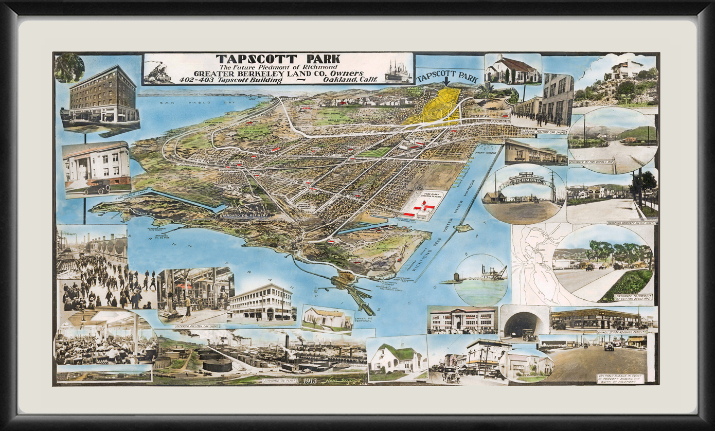 Restored bird’s eye view of Richmond, California, 1913 showing the proposed Tapscott Park development, “The New Piedmont of Richmond” by Nahl Studios.