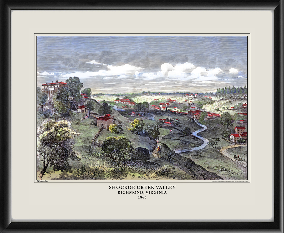 Restored bird’s eye view of Shockoe Creek Valley, Richmond, Virginia, 1866 from the original engraving by J.R. Hamilton, published in Harper’s Weekly.