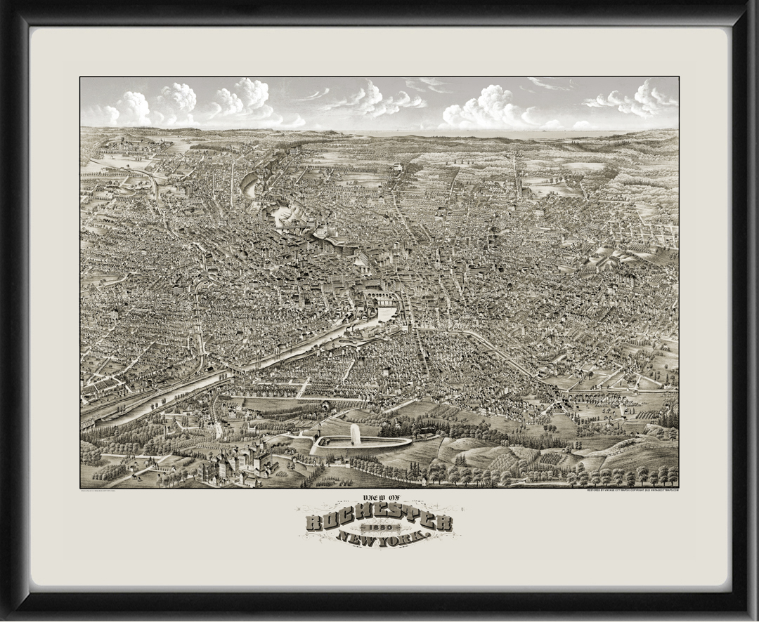 Restored bird’s eye view map of Rochester, New York, 1880 by H.H. Rowley