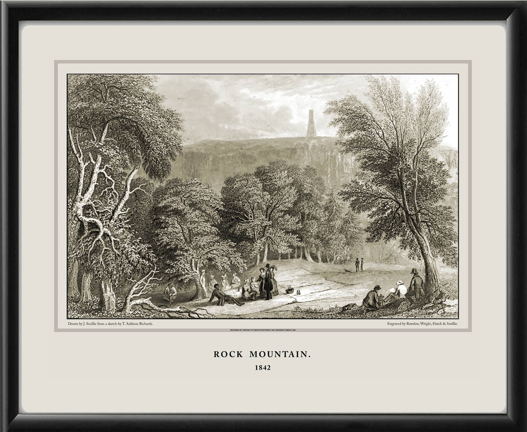Restored bird’s eye view engraving of Rock Mountain, Georgia, 1842 drawn by J. Smillie from an original sketch by Thomas Addison Richards.
