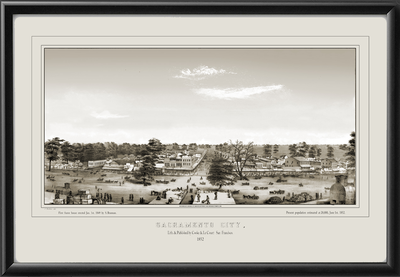 Restored bird’s eye view of Sacramento, California, 1852 by Joseph Britton.