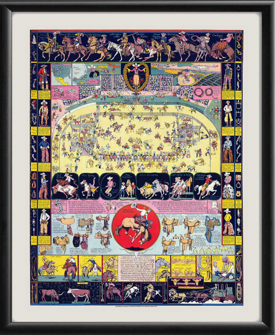 Restored pictorial bird’s eye view map of Salinas Rodeo, Salinas, California, 1933 by Jo Mora, showing various types of cowboys, their fashions, their saddles, their horses, and their relationship to the cattle, plus a rodeo scene with illustrations depicting different rodeo activities