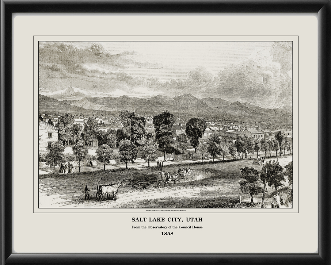 Restored bird’s eye view of Salt Lake City, Utah, from the Observatory of the Council House, from the original engraving published in Harper’s Weekly, 1858.
