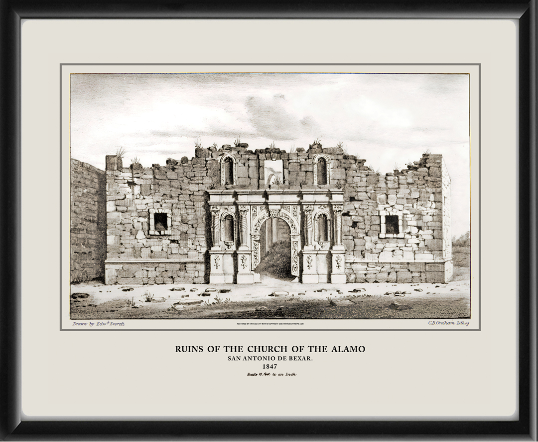 Restored view of The Alamo in San Antonio, Texas, 1847 from the original watercolor made by Sgt. Edward Everett of the First Regiment of Illinois Volunteers during the U.S. War with Mexico.