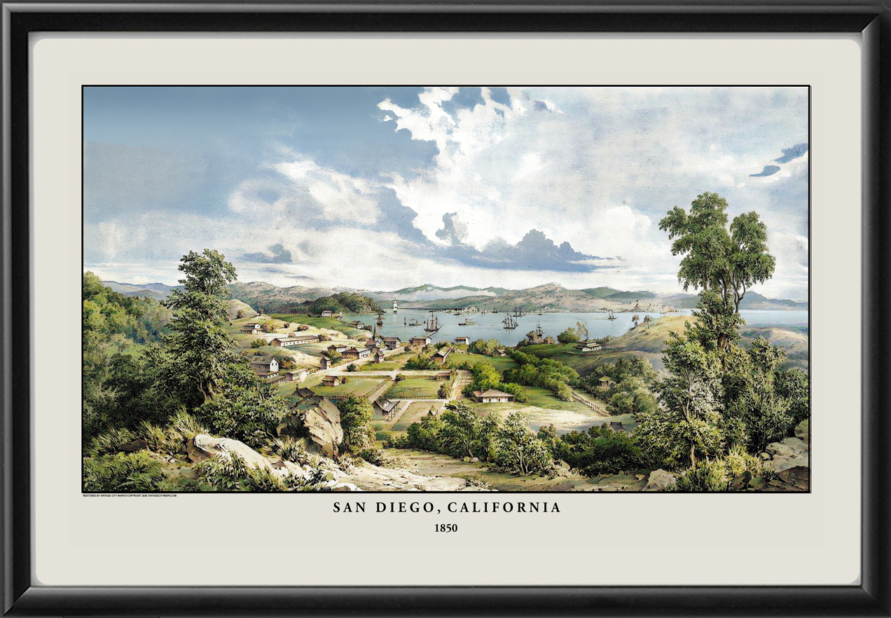 Restored bird’s eye view of San Diego, California, circa 1850, artist unknown.