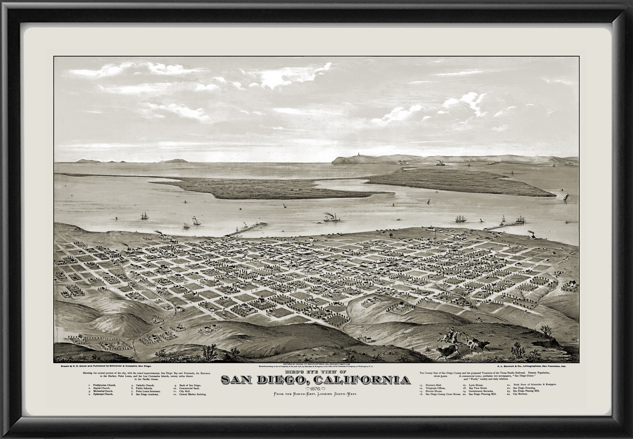 Restored bird’s eye map of San Diego, California, 1876 by Eli Shelton Glover.