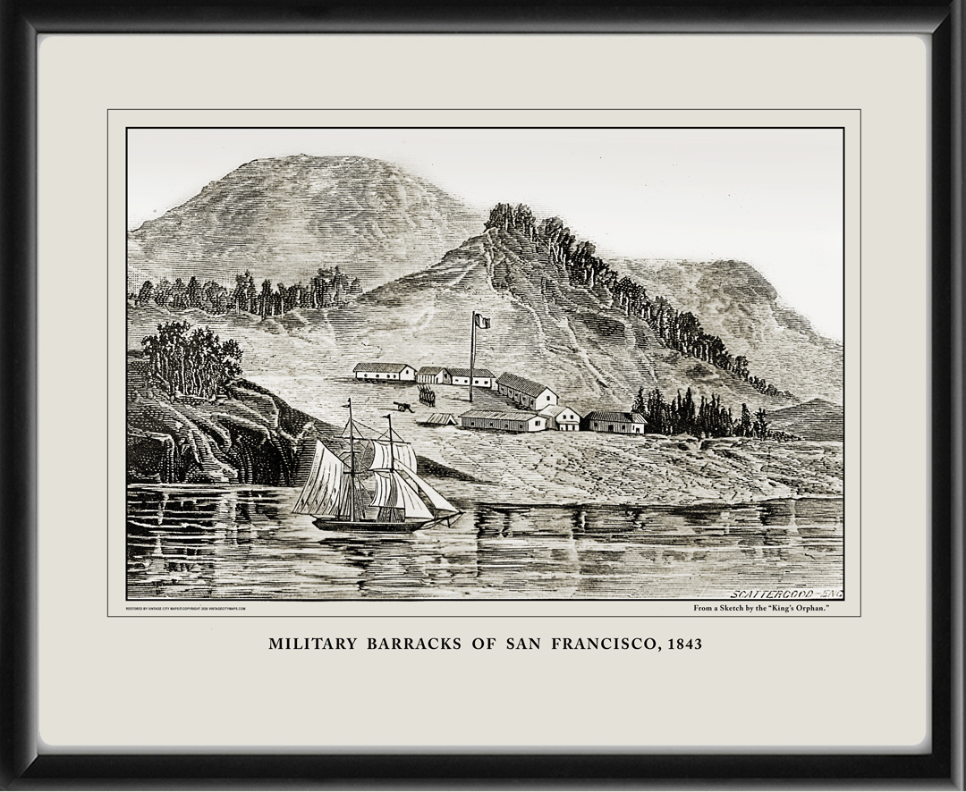 Restored bird’s eye view of Military Barracks at the Presidio of San Francisco, 1843, sketched by G.M. Waseurtz and engraved by David Scattergood