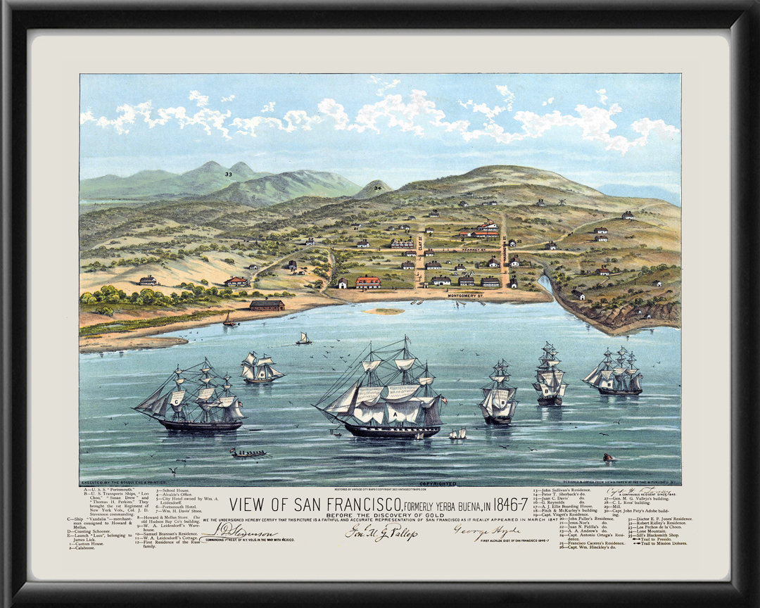 Restored bird’s eye view of San Francisco, California, as viewed from the harbor, 1846-7 by Capt. W. Swasey.