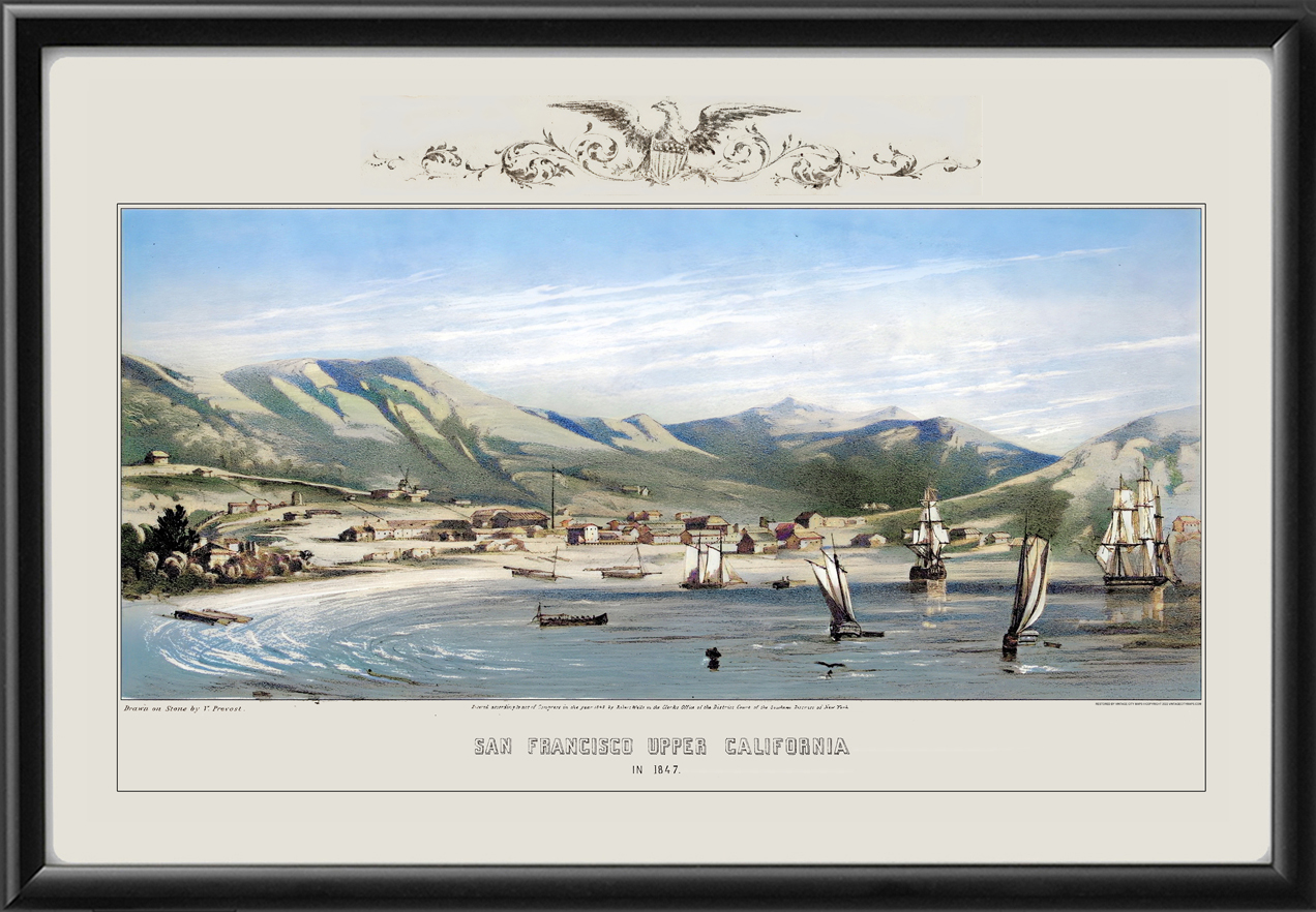 Restored panoramic view of San Francisco, Upper California, 1847 by Victor Prevost.