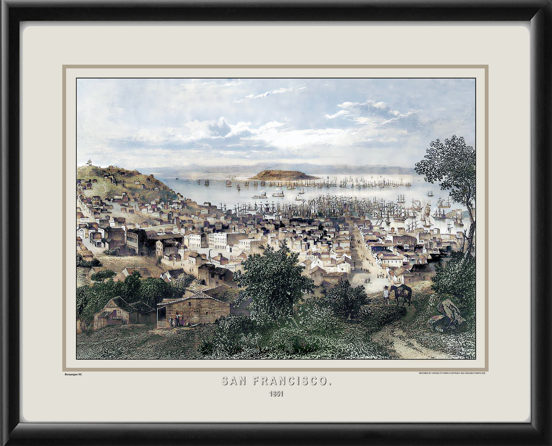 Restored bird’s eye view of San Francisco, California, 1851 from the original engraving by French artist Adolphe Rouargue.