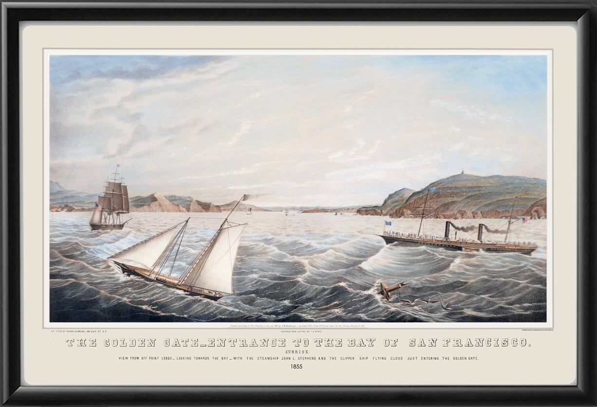 Restored panoramic view of the Golden Gate entrance to San Francisco Bay, 1855 by Thomas A. Ayres. View from off Point Lobos looking toward the bay with the steamship John L. Stephens and the clipper ship Flying Cloud entering the Golden Gate at sunrise.