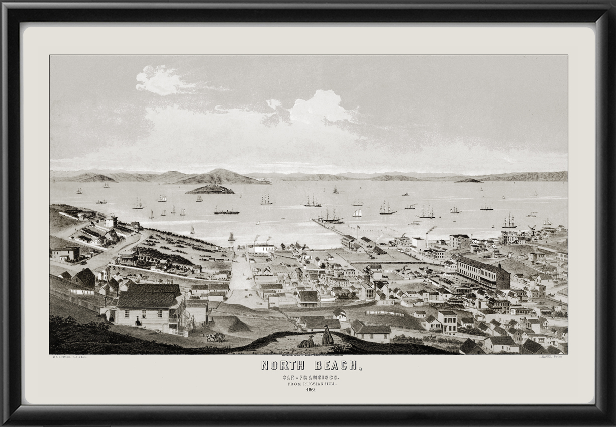Restored bird’s eye view of North Beach in San Francisco, California, 1861 by Charles Gifford.