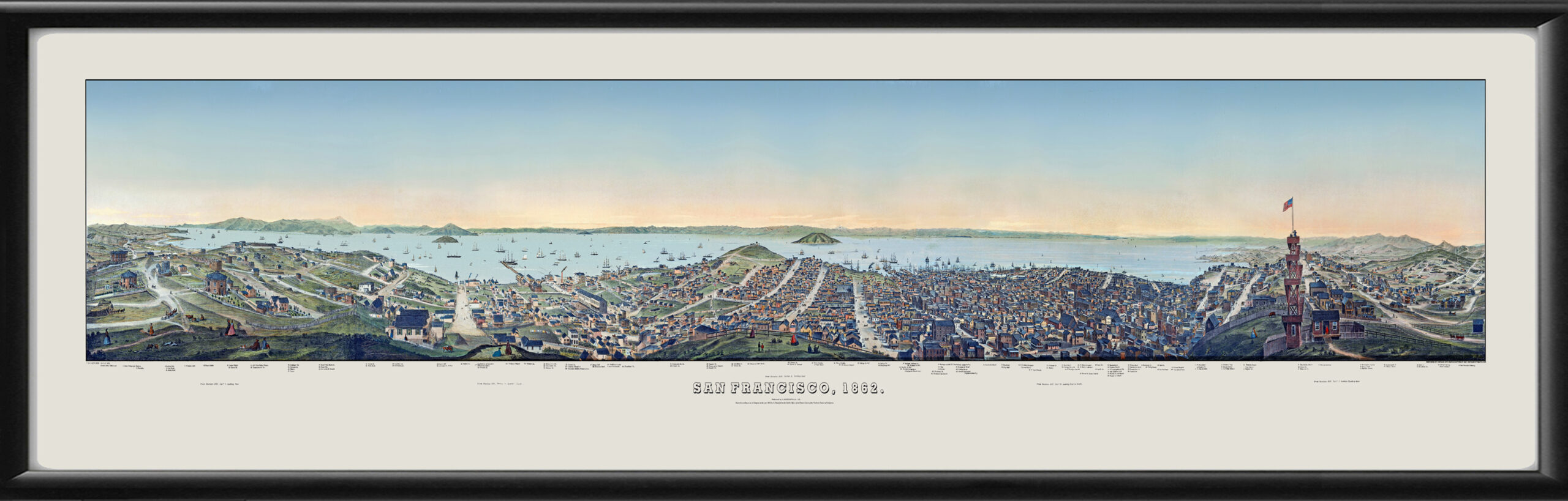 Restored panoramic view of San Francisco, 1862 by C.B. Gifford in full color, combining 5 sections and a 360 degree view from the top of Russian Hill.
