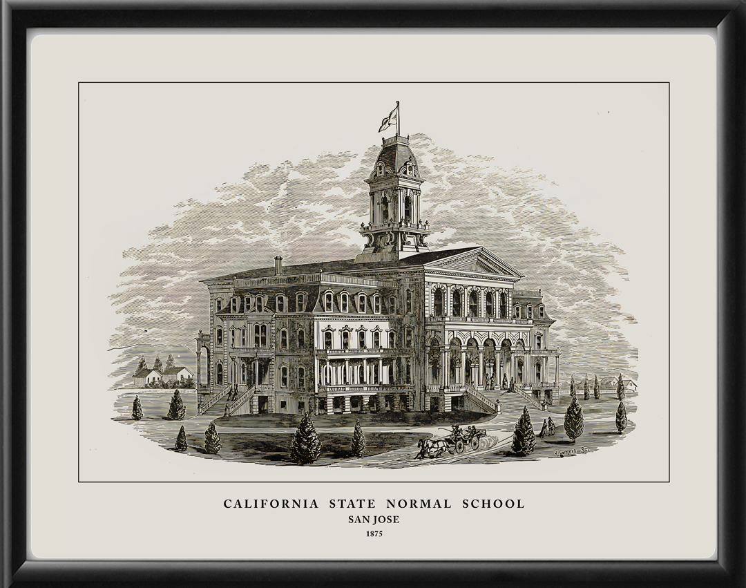Restored view of California State Normal School, now San Jose State University, in San Jose, California, 1875 from the original engraving by L. Curtis. The building was destroyed by fire and rebuilt in 1880. https://www.vintagecitymaps.com/product/california-state-normal-school-san-jose-1880/