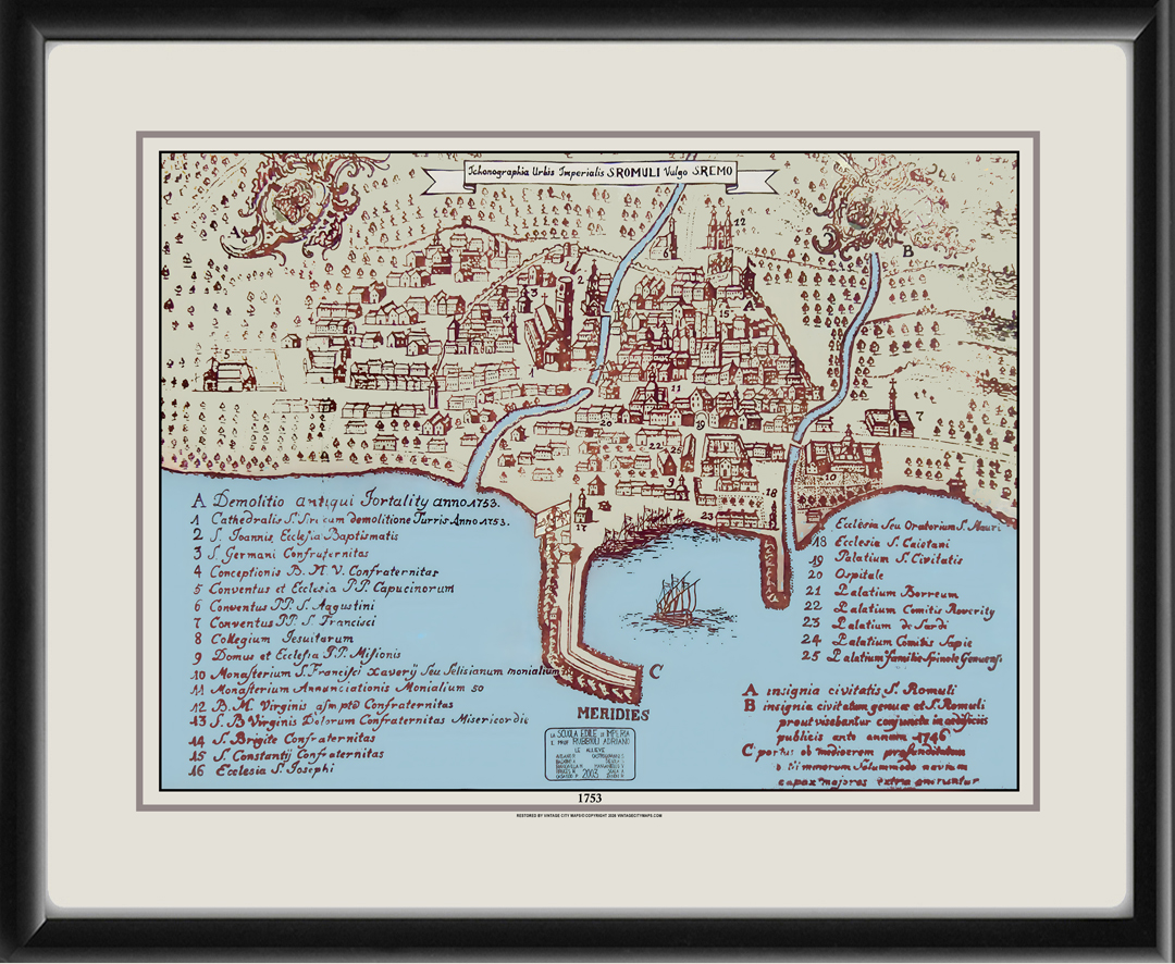 Restored bird’s eye view map of San Remo, Italy on the Italian Riviera, 1753 by Georges Jansoone