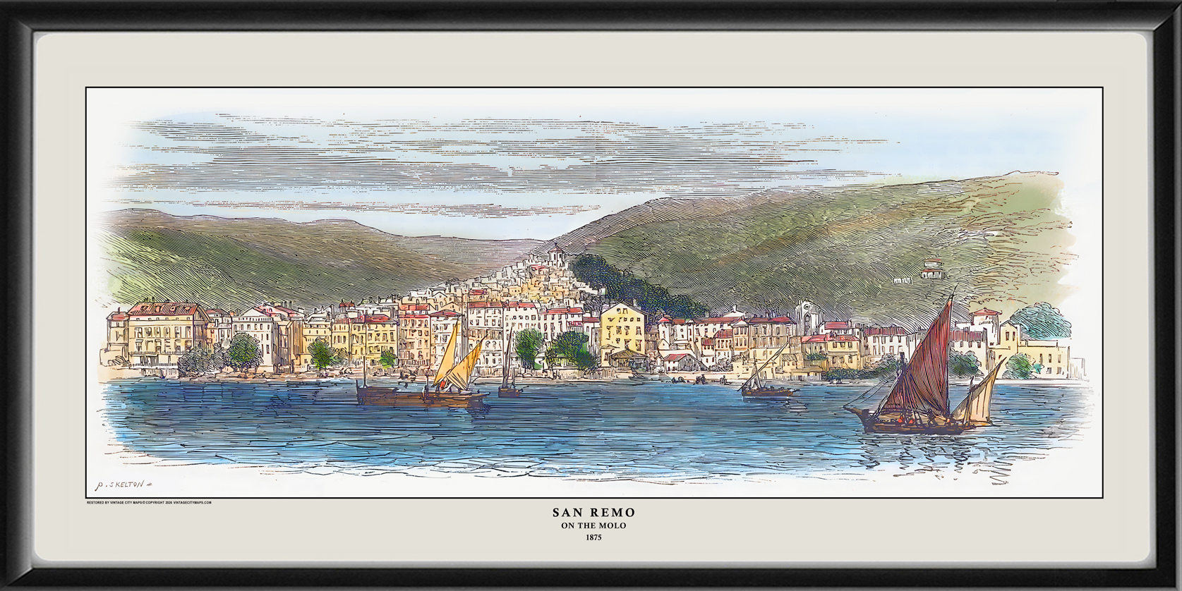 Restored panoramic view of San Remo, Italy on the Italian Riviera showing the city from the south and the molo (harbor wall) from the original 1875 engraving by P. Skelton