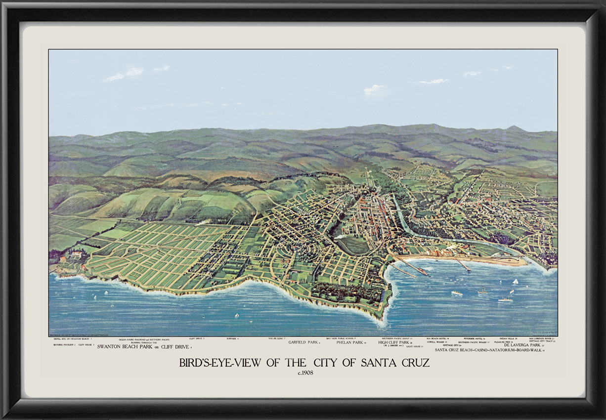 Restored bird’s eye view of Santa Cruz, California, circa 1908 by F.W. Swanton.