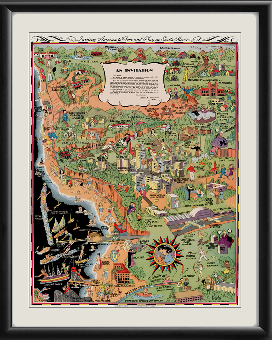Restored pictorial bird’s eye view map of Santa Monica, California, 1940 by Rena Roblin, “Inviting America to Come and Play in Santa Monica.”