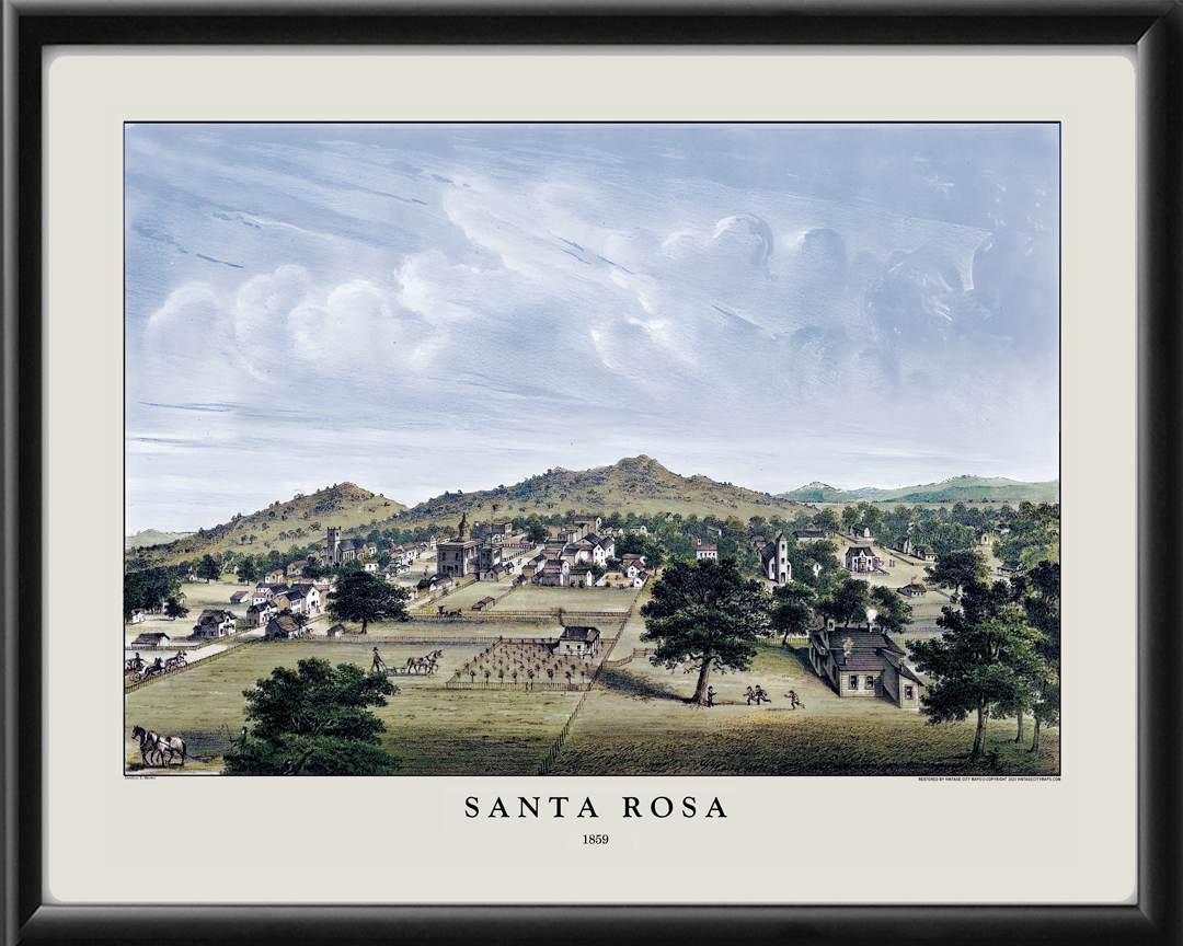 Restored panoramic view of Santa Rosa, California, circa 1859 by Kuchel & Dresel, from sketches by Grafton T. Brown.