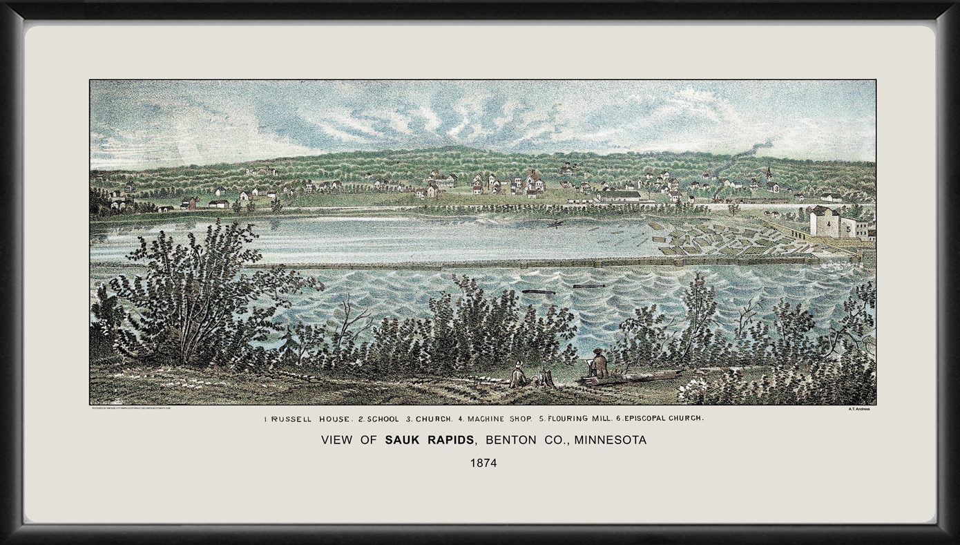 Restored panoramic view of Sauk Rapids, Minnesota, 1874 by Alfred T. Andreas.