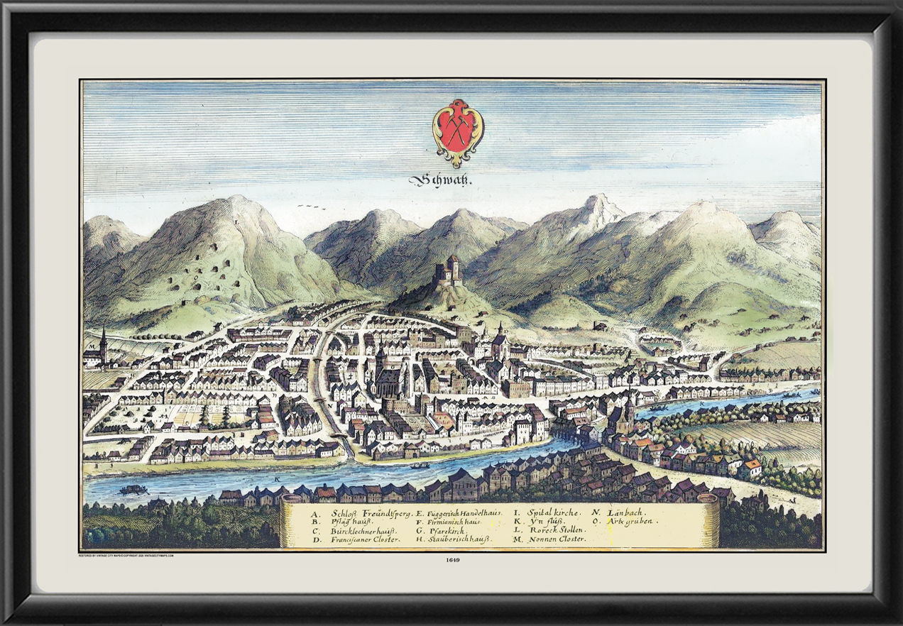 Restored bird’s eye view of the city of Schwaz, Austria, from across the Inn river at the foot of the Kellerjoch and Eiblschrofen mountains, 1649 by Matthaus Merian