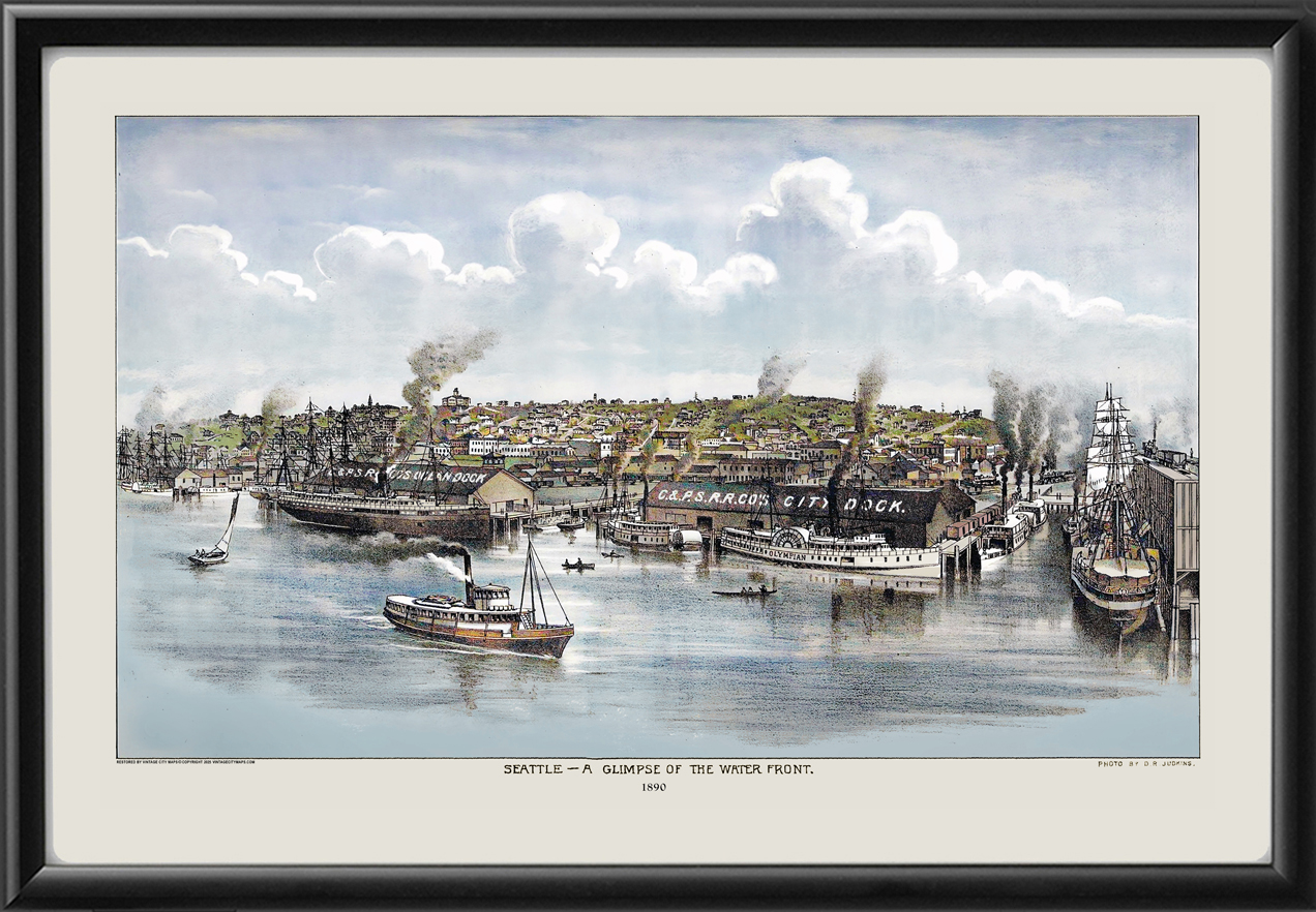 Restored panoramic view of the Seattle waterfront in Seattle, Washington, 1890, by D. R. Judkins
