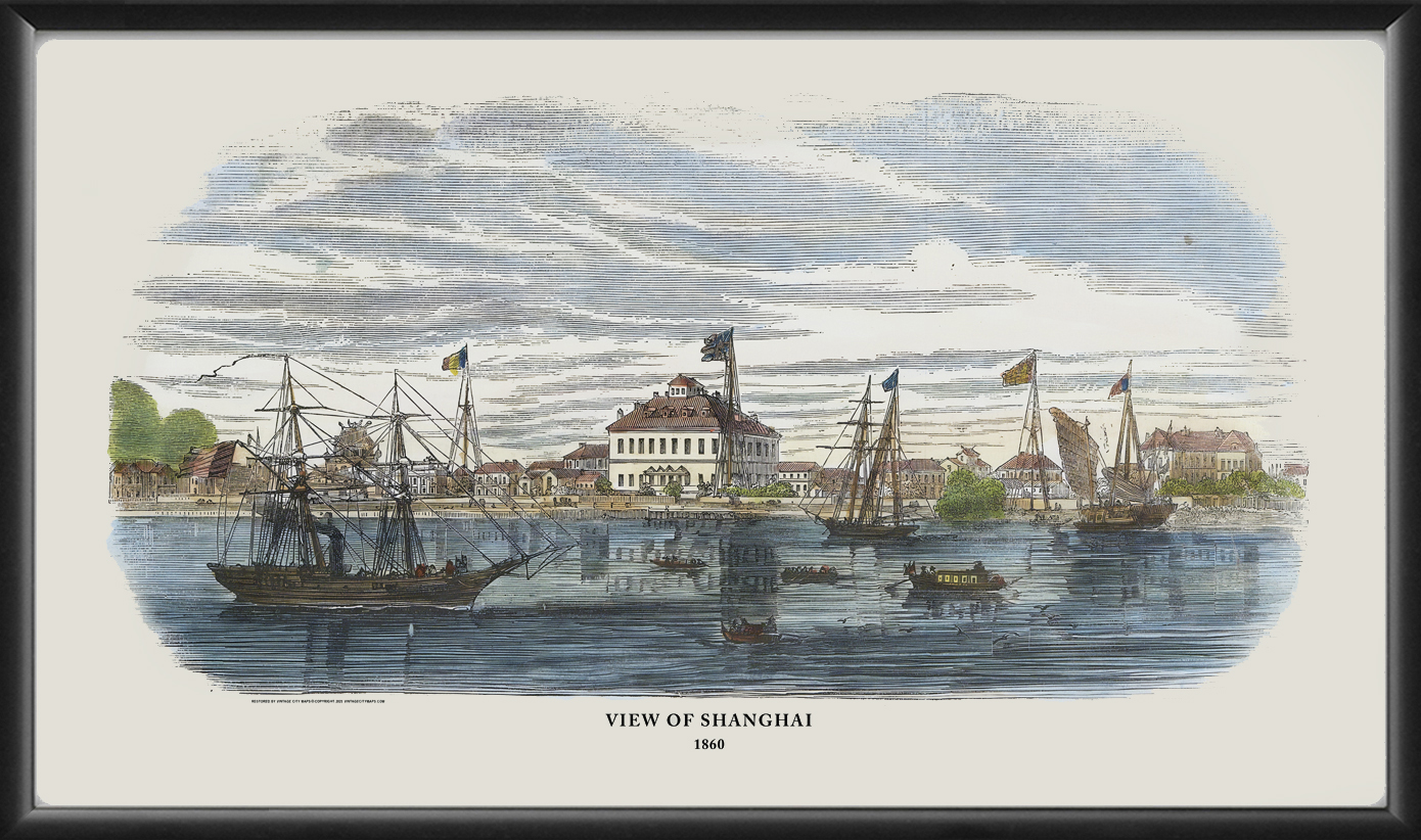 Restored panoramic view of Shanghai, China viewed from across the Huangpu River, 1860, from the original engraving published in the Illustrated London News.