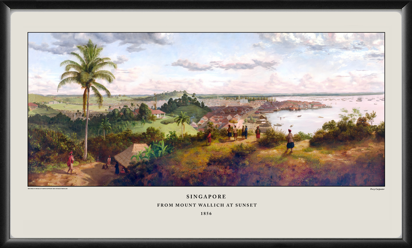 Restored bird’s eye view of the Singapore River settlement from Mount Wallich at sunset, 1856 by Percy Carpenter