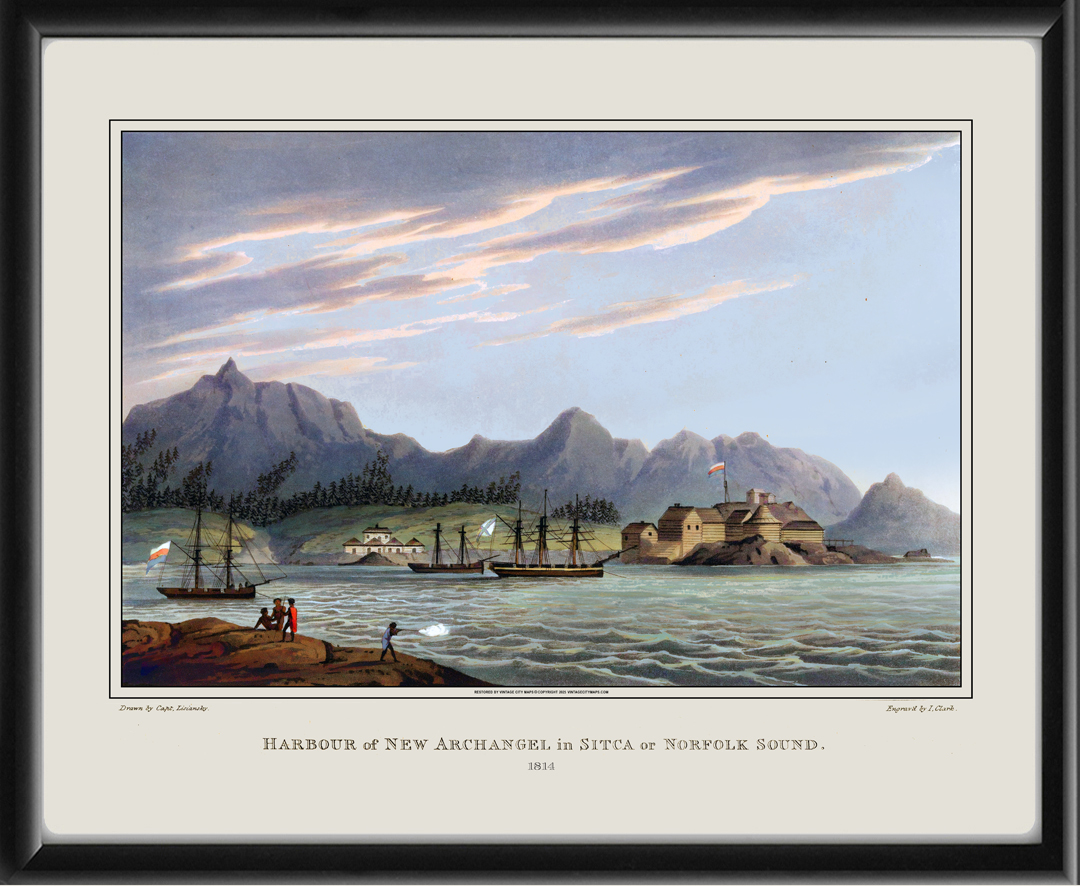 Restored panoramic view of the Harbour of New Archangel in Sitka, or Norfolk Sound, 1814 by Capt. Urey Lisiansky